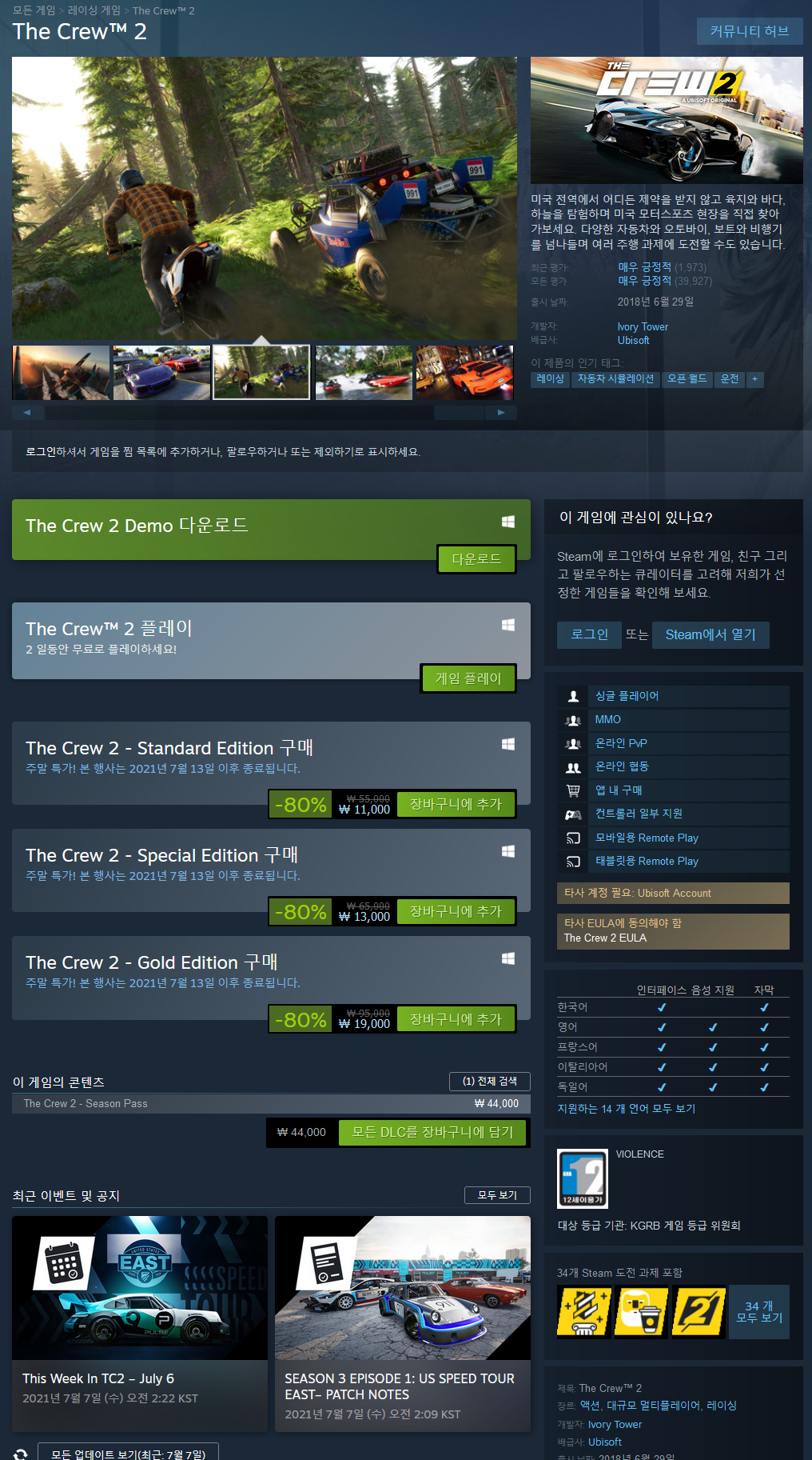 신작 레이싱 게임 The Crew® 2는 역대 가장 짜릿한 오픈 월드를 제공해 미국적인 모터스포츠의 전율을 담아냈습니다. 거대하고 다양하며 액션이 가득한 Motornation에 오신 것을 환영합니다. 육지, 바다, 그리고 하늘을 넘나들며 자유를 만끽하세요. 동해안에서 서해안까지, 길거리 레이서와 프로 레이서, 오프로드 전문가와 프리스타일러가 모두 모여 다양한 종류의 레이스를 선보입니다. 이들과 함께 경기하고 전 세계 사람들과 영광의 순간을 함께 나누세요.