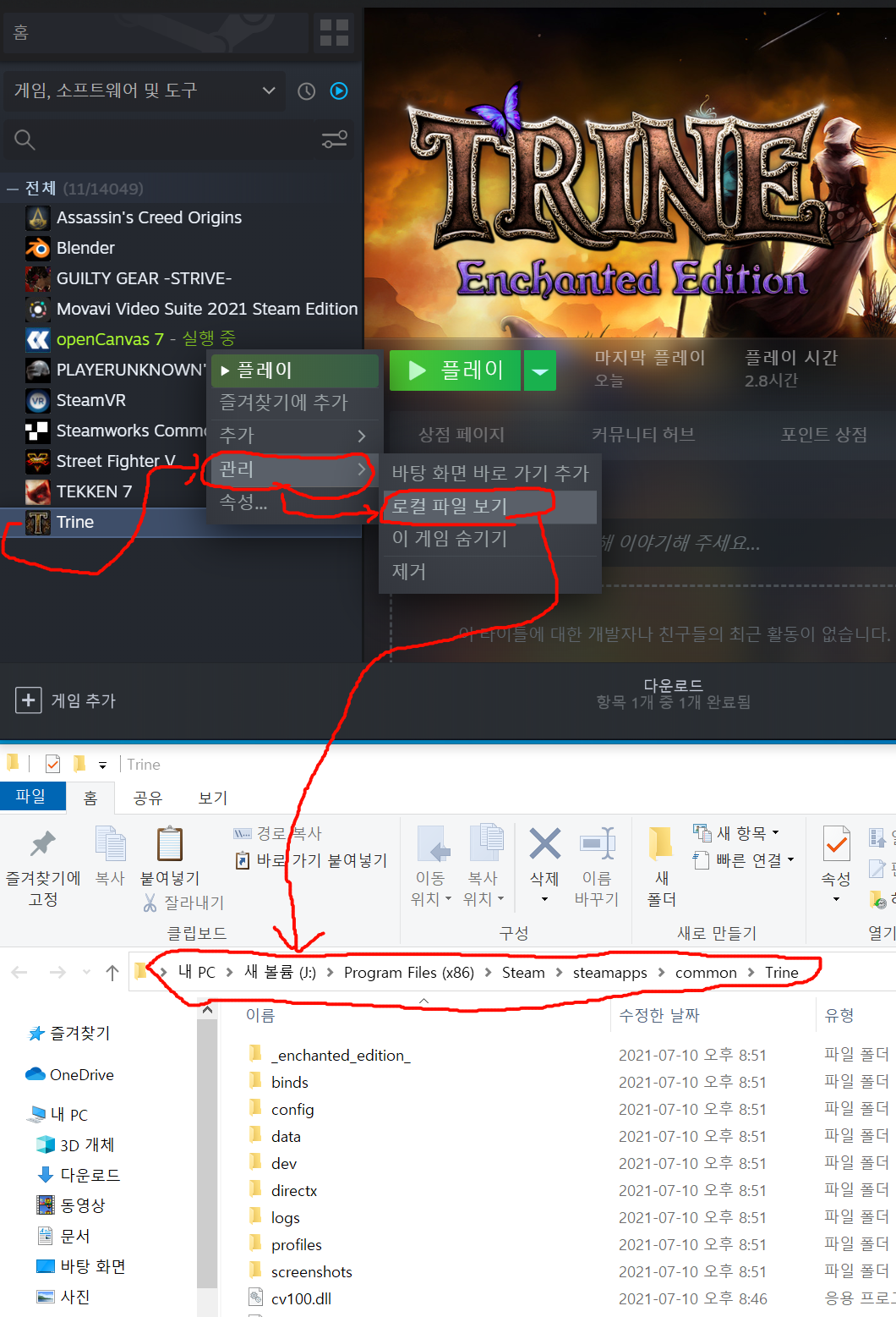 오른쪽 클릭후 "관리->로컬 파일 보기" 를 눌러주면 해당 설치된 폴더가 나옵니다.