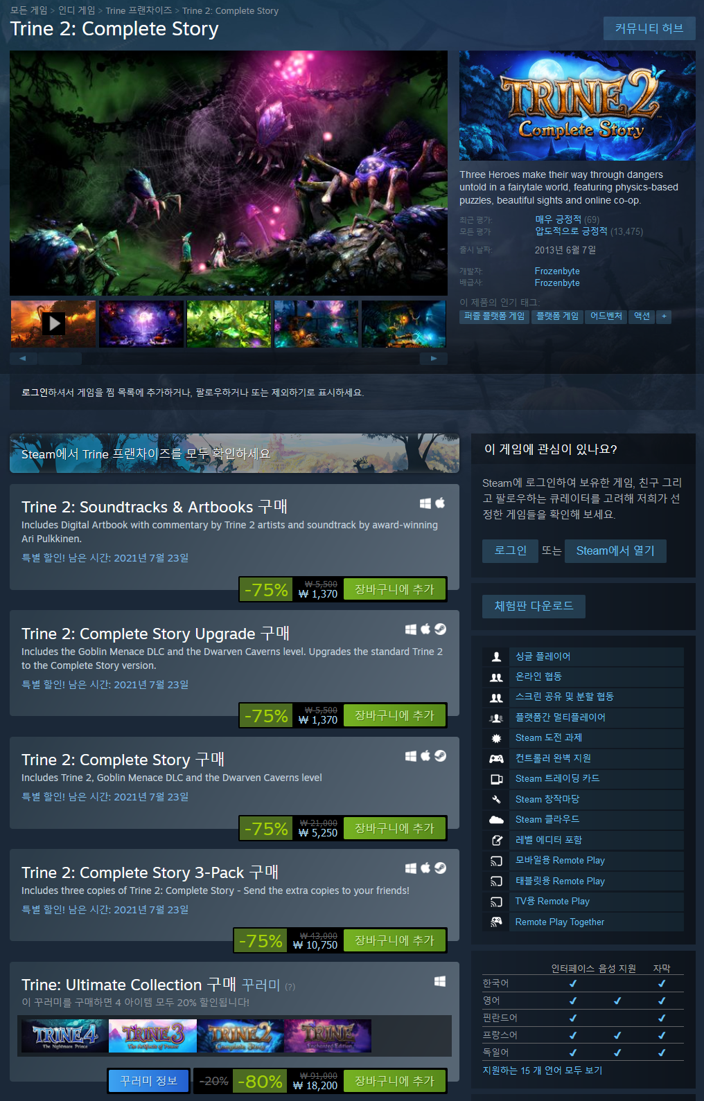 Frozenbyte의 간판, 트라인 3부작 중에서 미들을 맡고 있는 《트라인 2: 완전한 이야기》다. 전작을 한지 너무 오래되서 스토리도 제대로 기억이 안 난다. 2부는 대충, 트라인을 확보하고 평화롭게 살던 아마데우스, 폰티우스, 조야가 다시 트라인의 부름에 의해 세계를 구할 운명을 안고 모험을 떠난다라는 내용인 거 같다. 여전히 게임성은 뛰어나다. 플랫폼 어드벤처와 퍼즐, 그리고 액션은 이렇게 섞어야 한다는 걸 확실히 보여주는 게임.