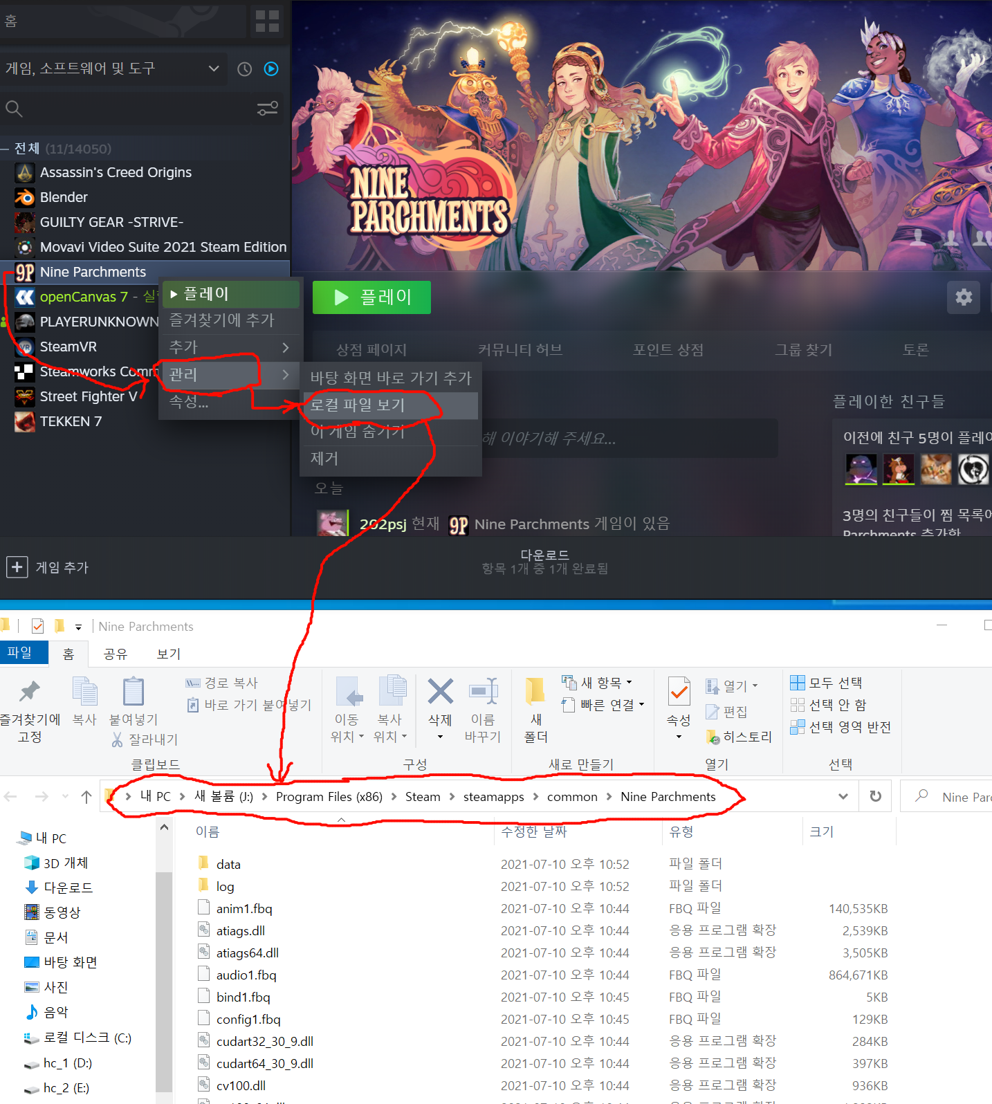 오른쪽 클릭후 "관리->로컬 파일 보기" 를 눌러주면 해당 설치된 폴더가 나옵니다.