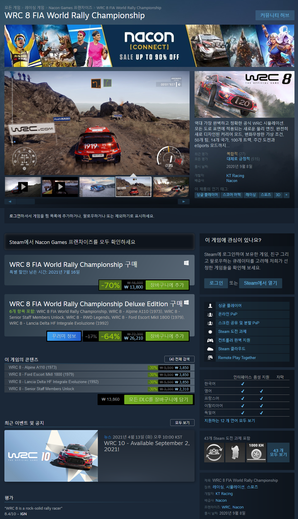 2019시즌의 50개 팀, 14개 랠리, 100개 이상의 특별 스테이지와 함께하는 WRC 8은 오프로드 레이싱 게임 역사상 가장 풍부한 콘텐츠를 자랑합니다.