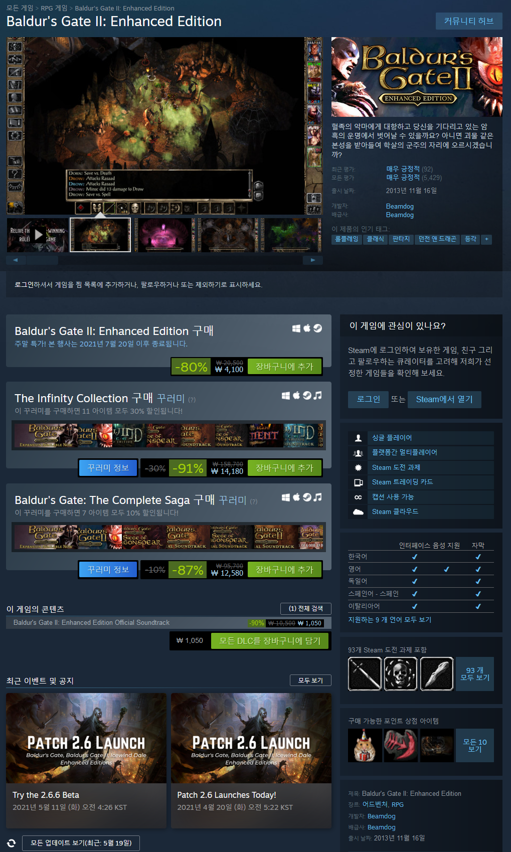 발더스 게이트: 인핸스드 에디션(Baldur’s Gate: Enhanced Edition)에서 시작된 여정을 이어나가거나 던전 앤 드래곤(Dungeons & Dragons)에서 완전히 새로운 캐릭터를 생성하세요. 업그레이드 및 개선을 마친 인피니티 엔진(Infinity Engine)으로 만나는 발더스 게이트 II: 인핸스드 에디션(Baldur’s Gate II: Enhanced Edition)에는 오리지널 쉐도우 오브 앤 어드벤처(the original Shadows of Amn adventure), 발라의 왕좌(the Throne of Bhaal) 확장팩, 새로운 신규 파티원 4명을 포함한 새로운 콘텐츠가 포함되어 있습니다.