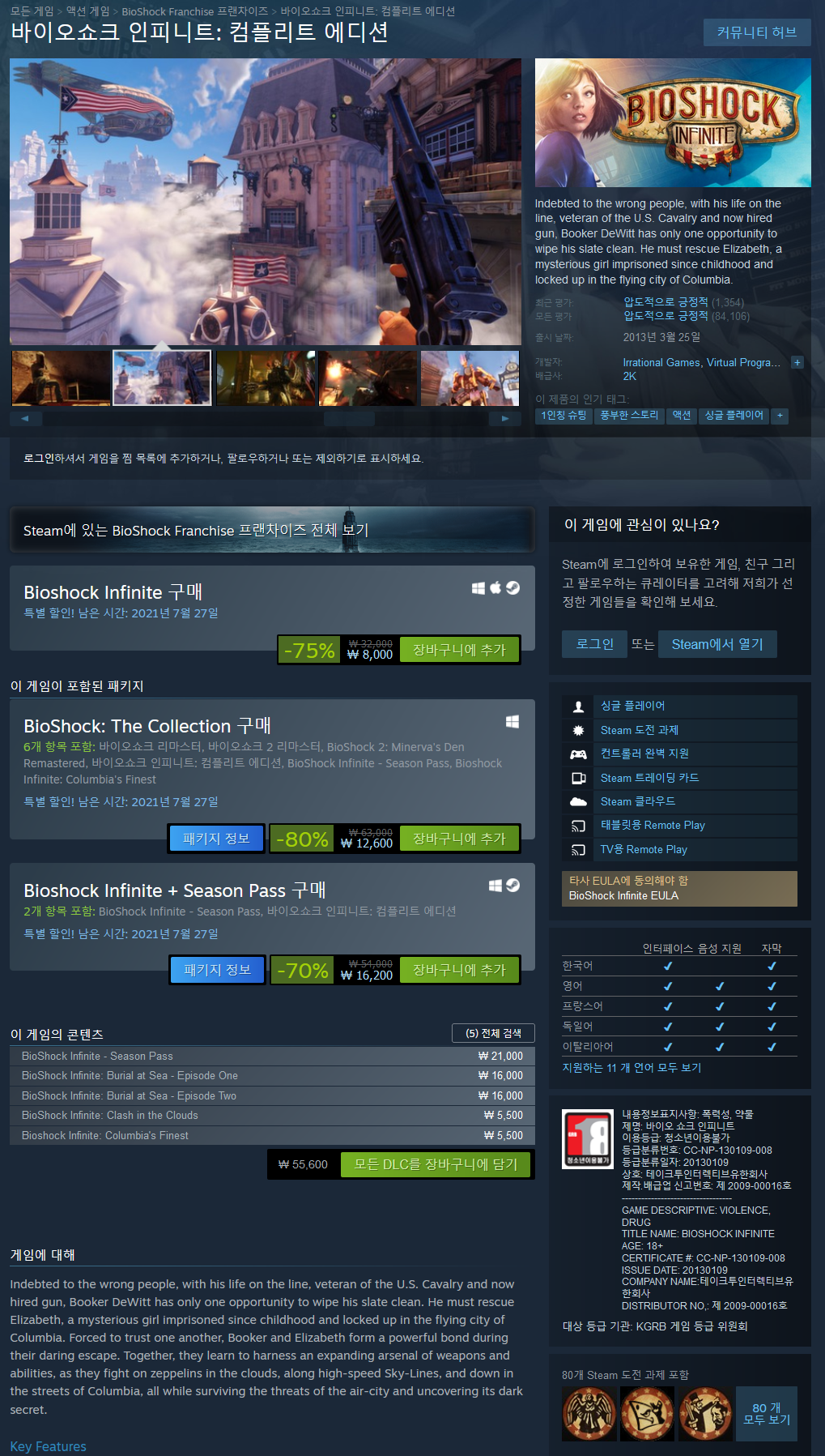 바이오쇼크 인피니트는 기존 바쇼 1,2보다는 그래픽이 많이 발전하였다. 게임 플레이는 익숙해지면 괜찮다. 게임에 실증 잘내는 사람들이라면 처음부터 너무 높은 난이도로 하지는 않는것을 추천한다. 본론으로 들어가자면 아직 구매안했다면 구매하기를 바란다.