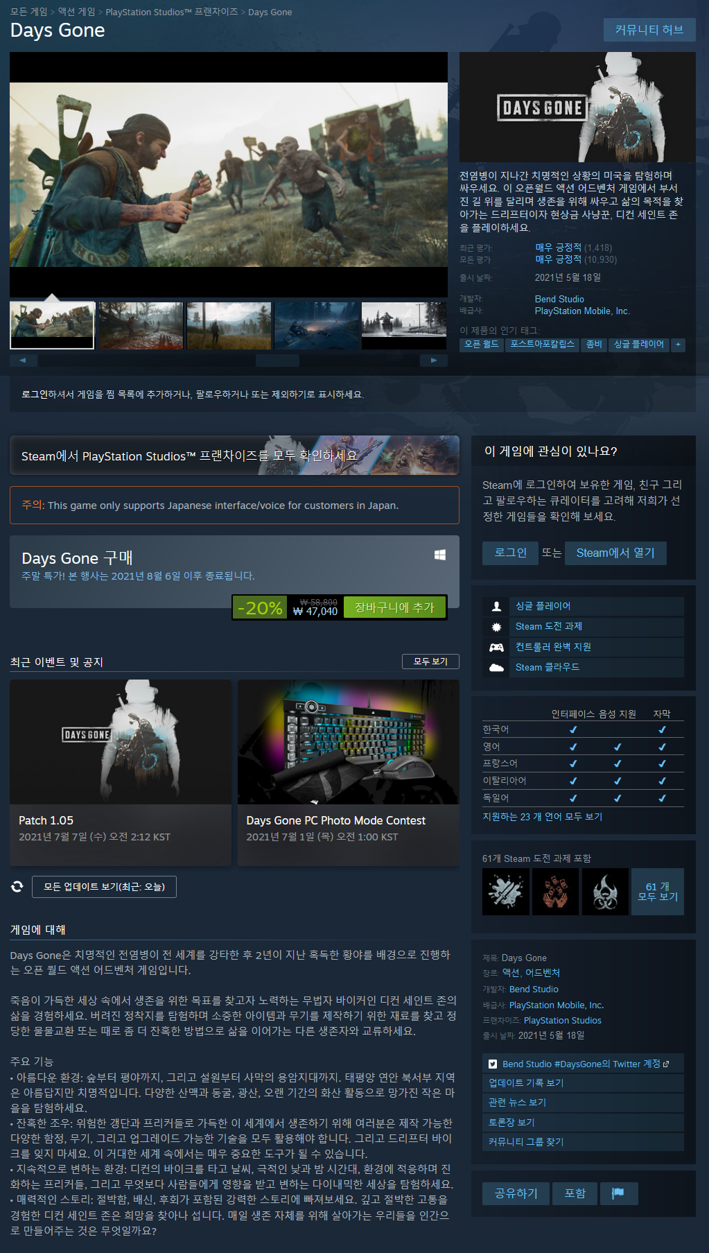 죽음이 가득한 세상 속에서 생존을 위한 목표를 찾고자 노력하는 무법자 바이커인 디컨 세인트 존의 삶을 경험하세요. 버려진 정착지를 탐험하며 소중한 아이템과 무기를 제작하기 위한 재료를 찾고 정당한 물물교환 또는 때로 좀 더 잔혹한 방법으로 삶을 이어가는 다른 생존자와 교류하세요.