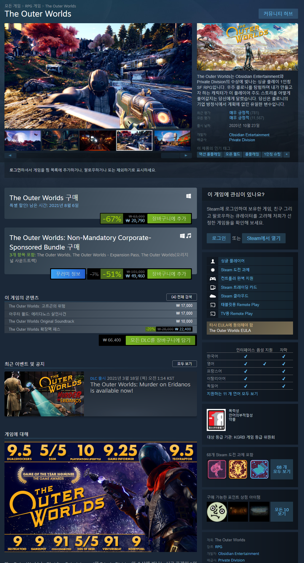 The Outer Worlds는 Obsidian Entertainment와 Private Division의 수상에 빛나는 싱글 플레이 1인칭 SF RPG입니다.