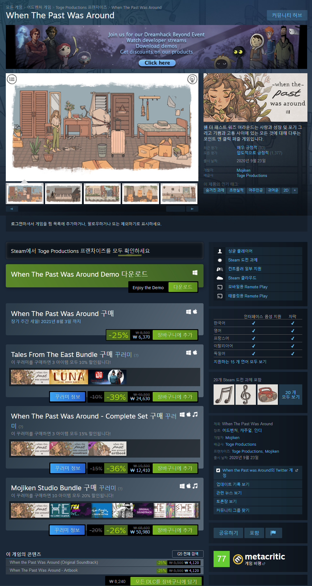 'When the Past Was Around'는 2시간 내에 끝낼 수 있는 짧고 조용한 서사체의 체험을 담고 있습니다. 짧은 게임임에도 불구하고 저희는 여러분들에게 마음을 울리는 의미 있는 경험을 전달하기 위해 심혈을 기울여 이 게임을 제작했습니다. 저희는 여러분들이 에다, 올빼미와 함께 값진, 그리고 잊을 수 없는 시간을 보냈기를 소망합니다.