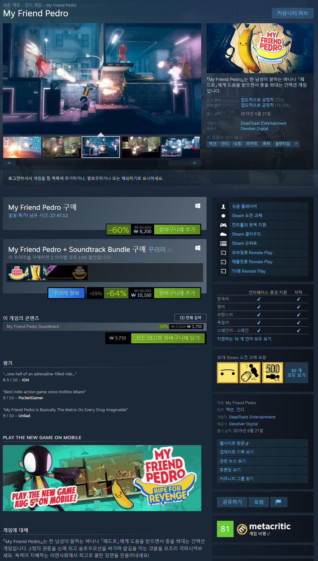 『My Friend Pedro』는 한 남성이 말하는 바나나 「페드로」에게 도움을 받으면서 총을 쏴대는 건액션 게임입니다. 2정의 권총을 손에 쥐고 슬로우모션을 써가며 앞길을 막는 것들을 모조리 격파시켜보세요. 폭력이 지배하는 이면사회에서 최고로 쿨한 장면을 만들어내세요!