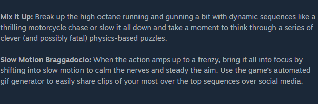 Full Throttle Gun Ballet: Unleash a torrent of destruction with an incredible level of control over both your weapons and your body. Twist and turn through the air while aiming both hands at priority threats or line up a perfect ricochet to drop an unsuspecting gangster from behind.