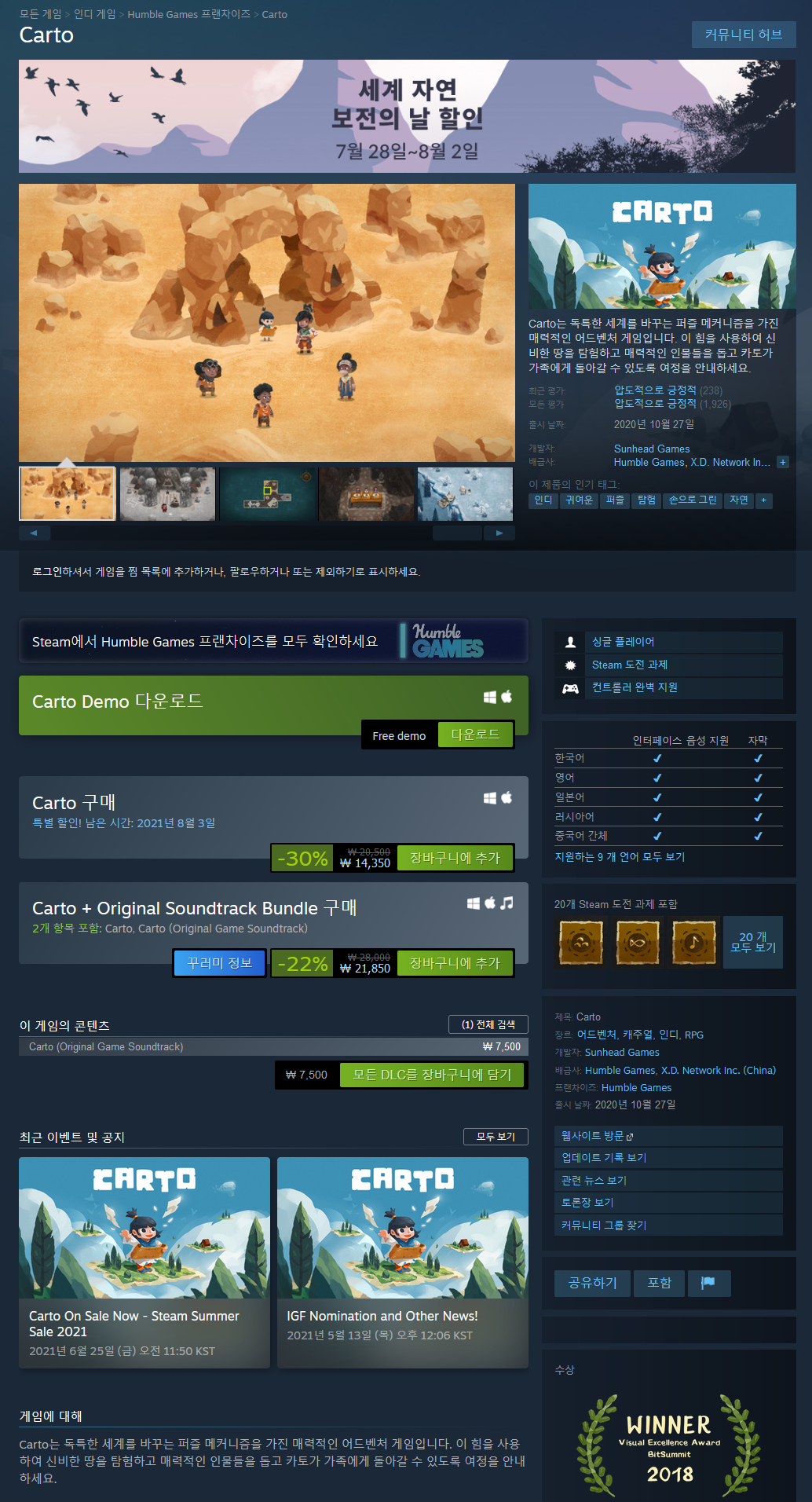 Carto is a charming adventure game wrapped around a unique, world-altering puzzle mechanic. Use this power to explore mysterious lands, help a quirky cast of characters, and guide Carto on her journey back to her family.