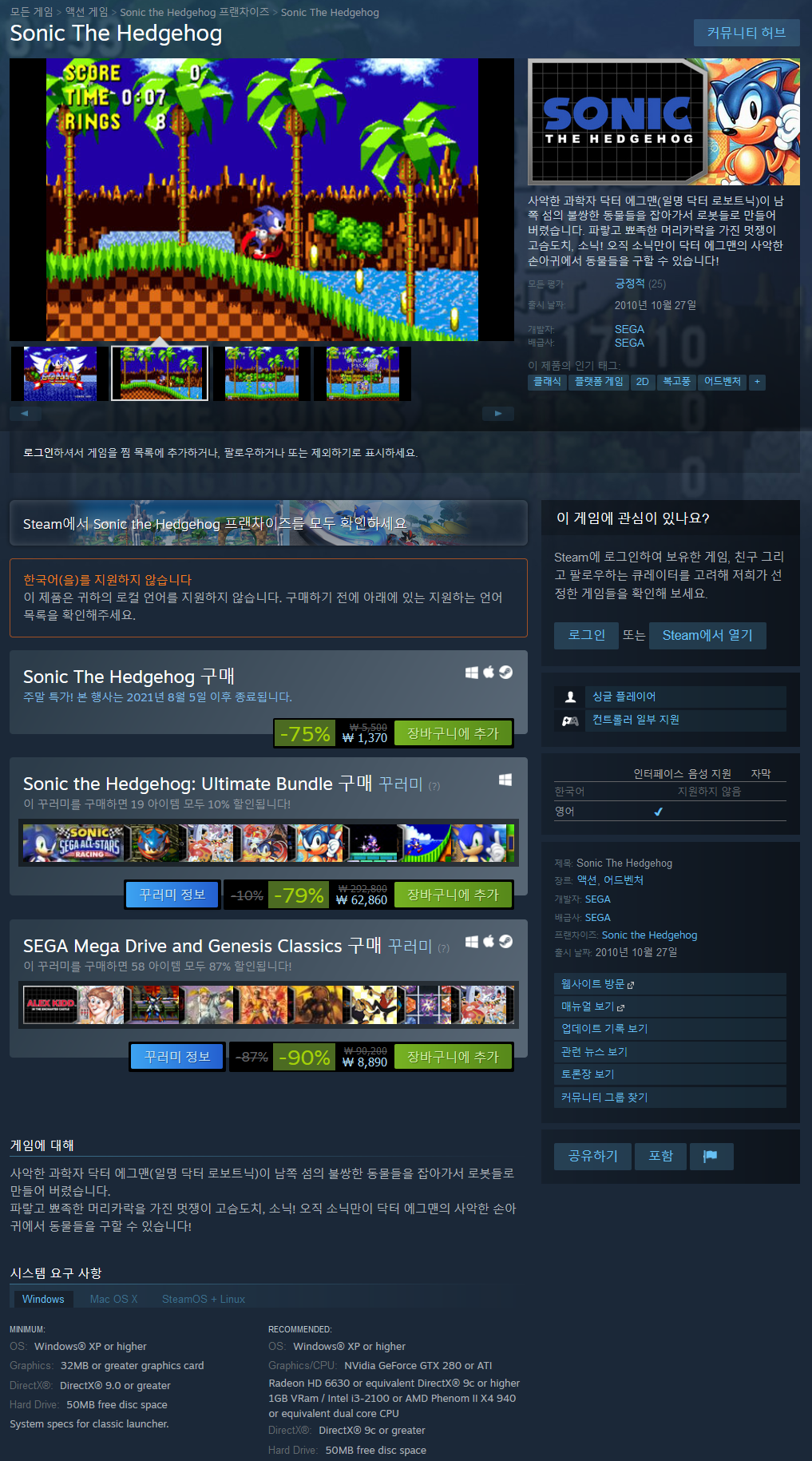 세가의 마스코트이자 전성기의 상징인 소닉의 그 첫 번째 이야기.