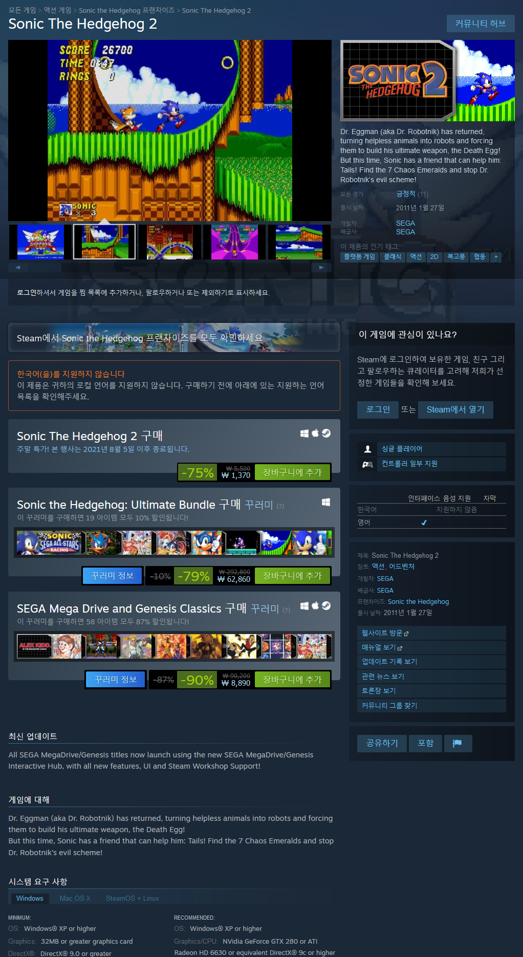 하지만 이번에는 Sonic에게 그를 도와줄 수 있는 친구가 있습니다. Tails! 7개의 혼돈 에메랄드를 찾아 Dr. Robotnik의 사악한 계획을 저지하세요!