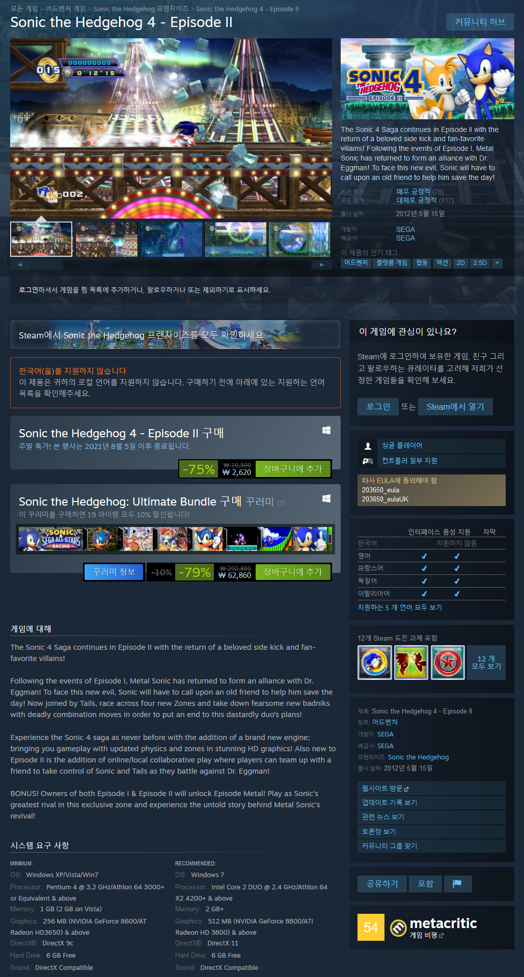 완전히 새로운 엔진을 추가하여 전에 없던 Sonic 4 사가를 경험하십시오. 놀라운 HD 그래픽의 업데이트된 물리 및 영역으로 게임 플레이를 제공합니다! 또한 에피소드 II의 새로운 기능은 플레이어가 친구와 팀을 이루어 Dr. Eggman과 싸울 때 Sonic과 Tails를 제어할 수 있는 온라인/로컬 협동 플레이가 추가되었다는 것입니다!