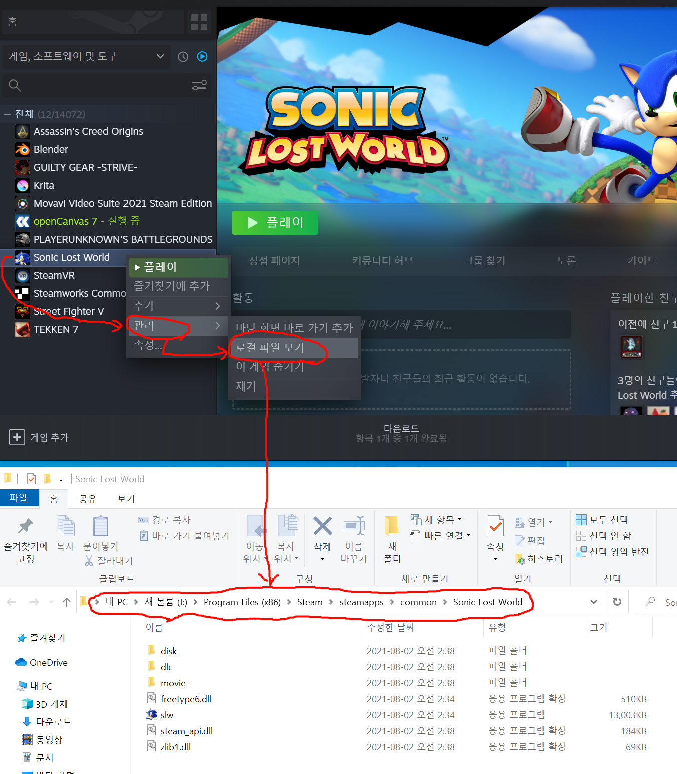 오른쪽 클릭후 "관리->로컬 파일 보기" 를 눌러주면 해당 설치된 폴더가 나옵니다.