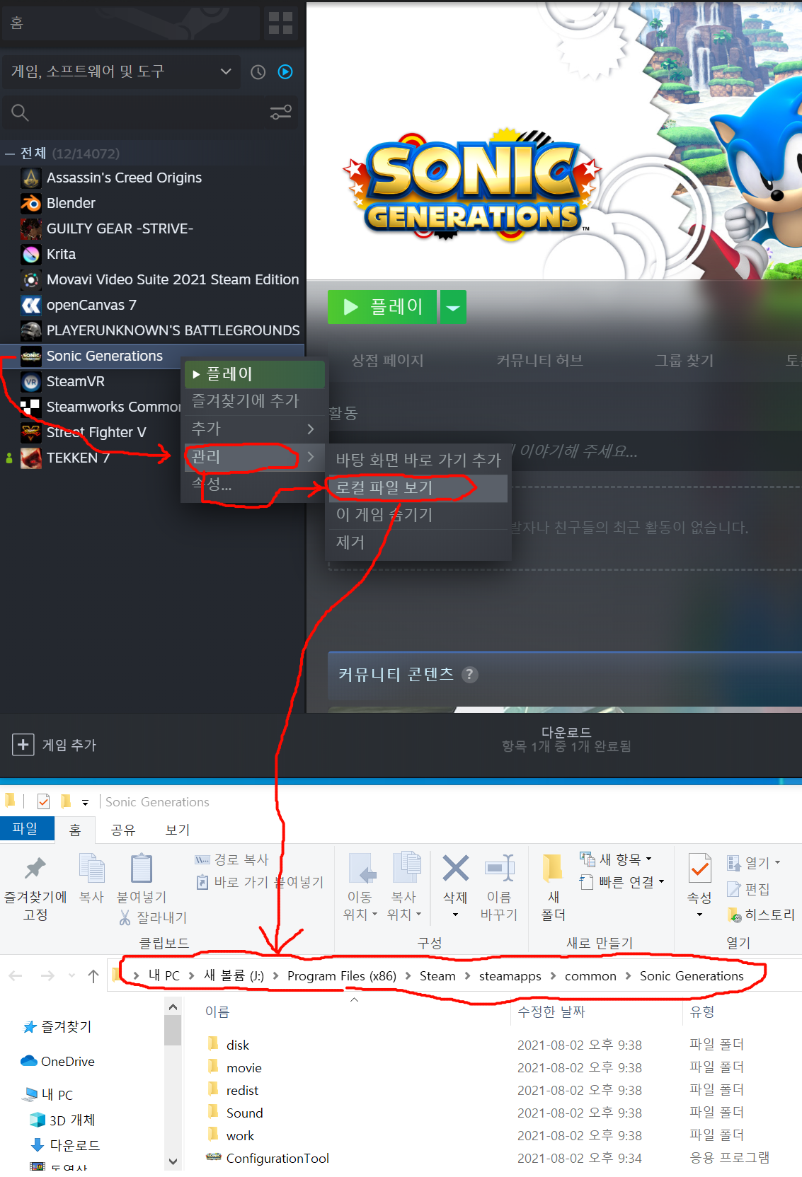 오른쪽 클릭후 "관리->로컬 파일 보기" 를 눌러주면 해당 설치된 폴더가 나옵니다.