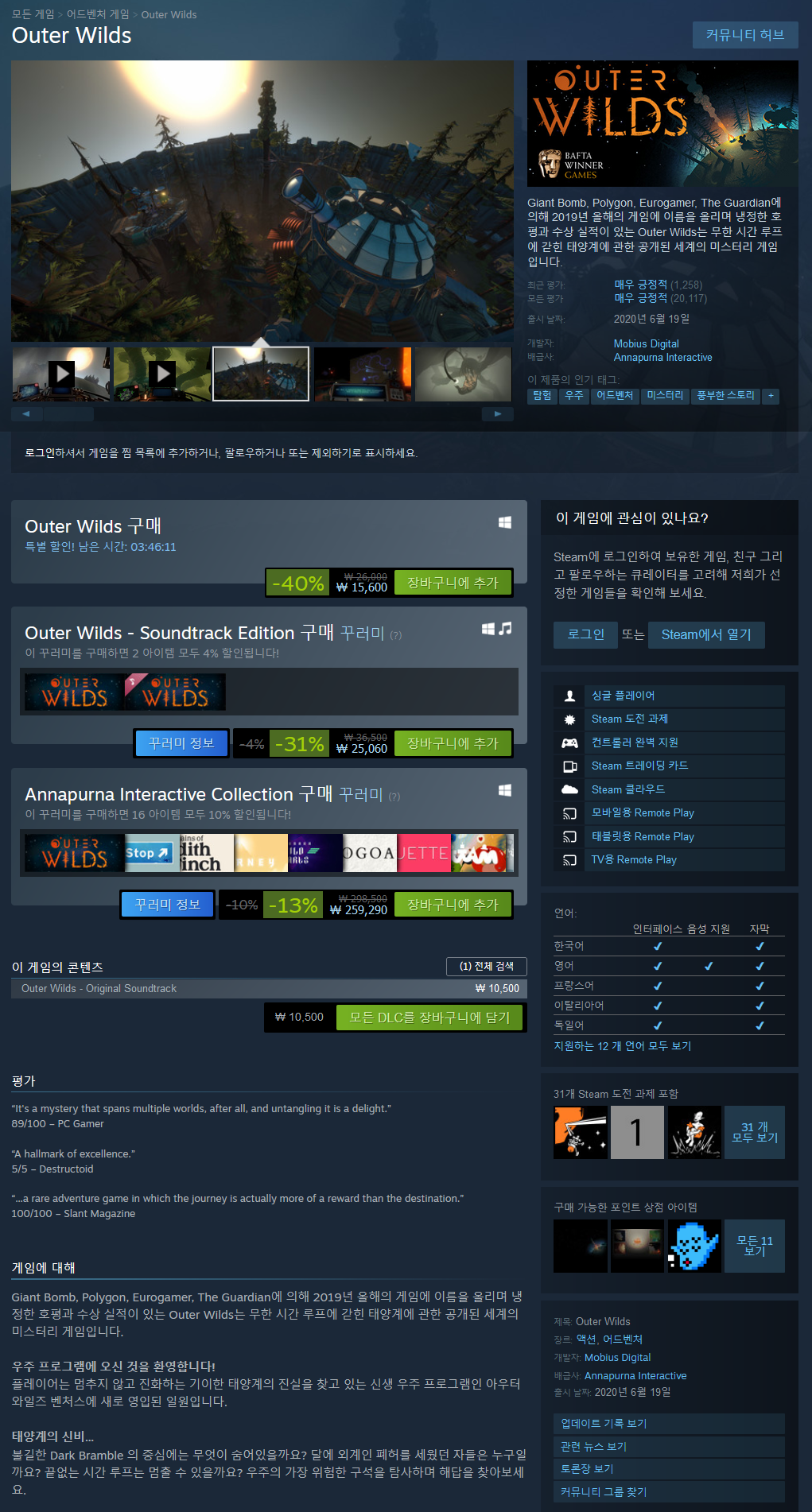Giant Bomb, Polygon, Eurogamer, The Guardian에 의해 2019년 올해의 게임에 이름을 올리며 냉정한 호평과 수상 실적이 있는 Outer Wilds는 무한 시간 루프에 갇힌 태양계에 관한 공개된 세계의 미스터리 게임입니다.