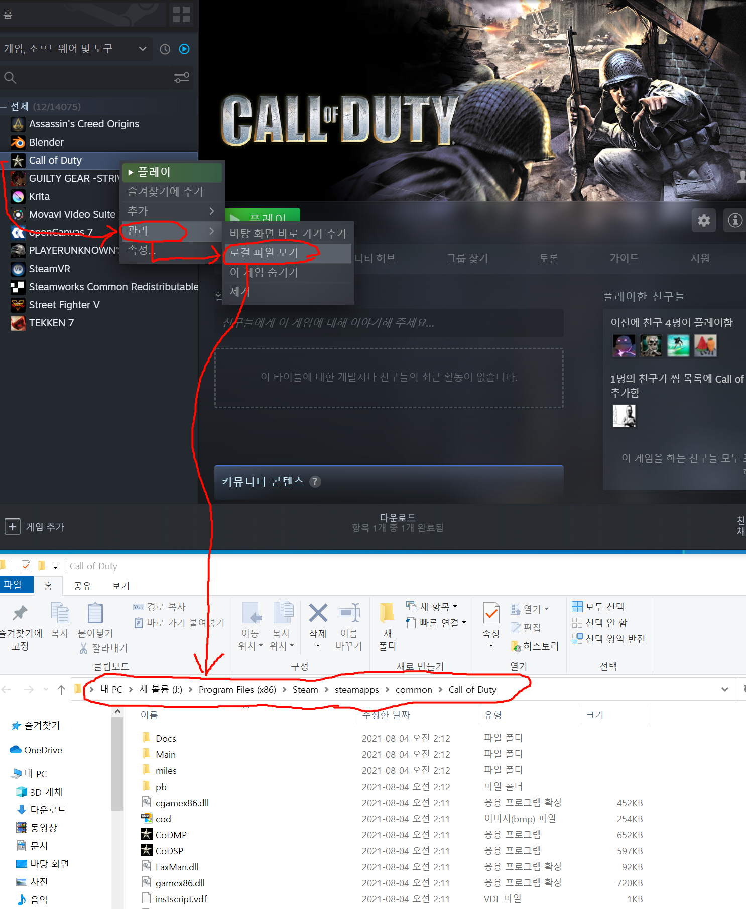오른쪽 클릭후 "관리->로컬 파일 보기" 를 눌러주면 해당 설치된 폴더가 나옵니다.