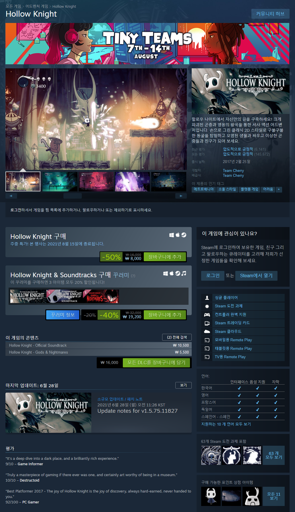 클래식한 게임플레이, 귀엽지만 으스스한 캐릭터, 서사적인 어드벤처와 아름다운 고딕 세계를 좋아하신다면 할로우 나이트가 기다리고 있어요!