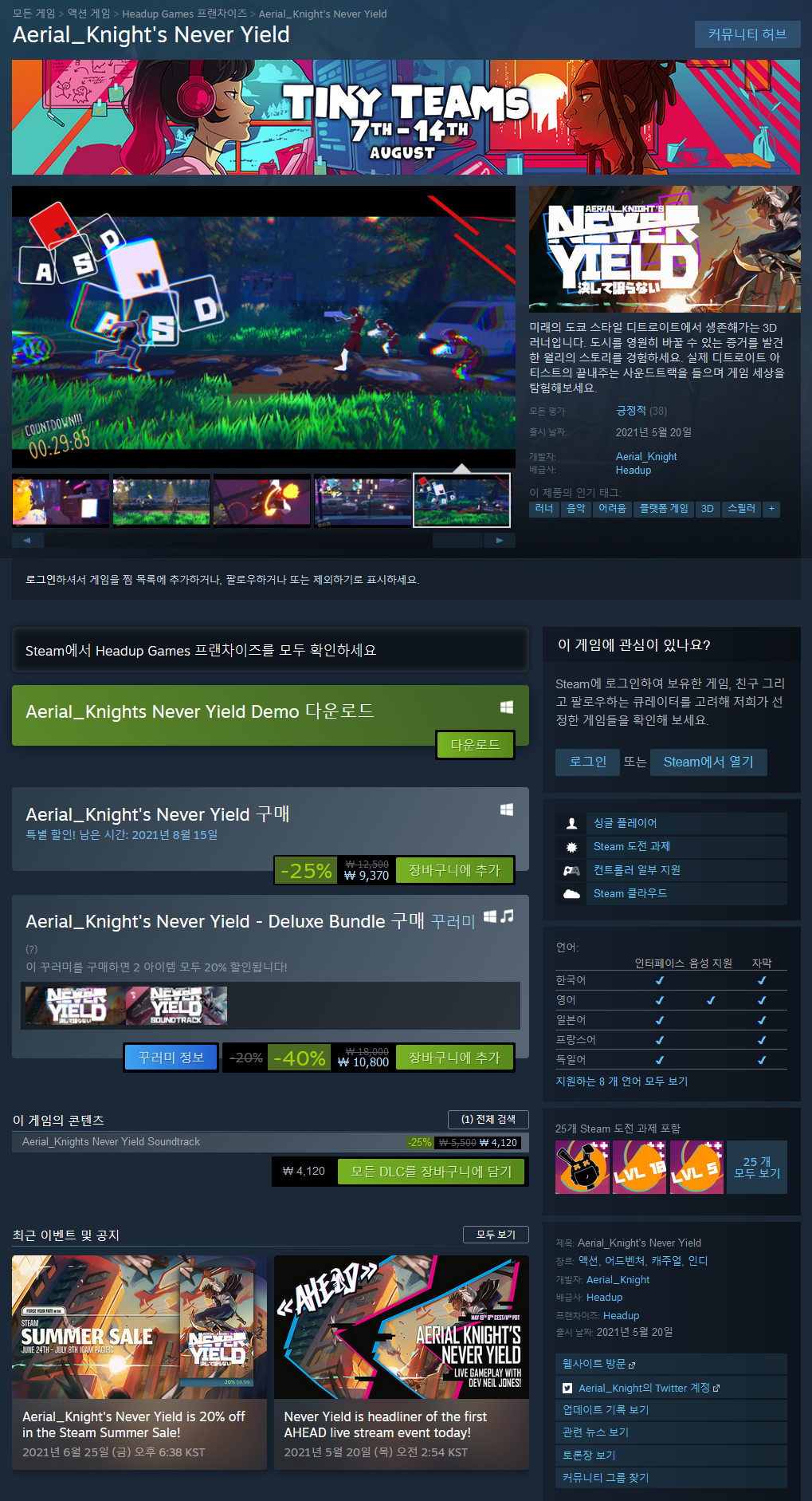 Aerial_Knight's Never Yield is a 3D side-scroller that plays much like a classic endless runner. The game has an interesting story that keeps players always in motion. Run, Jump, Slide or "Dash" for acrobatic variants leading to dope combinations and avoid the challenges that await. Aerial_Knight's Never Yield is being built for players who love to speedrun games while being an experience that casual players will enjoy as well.