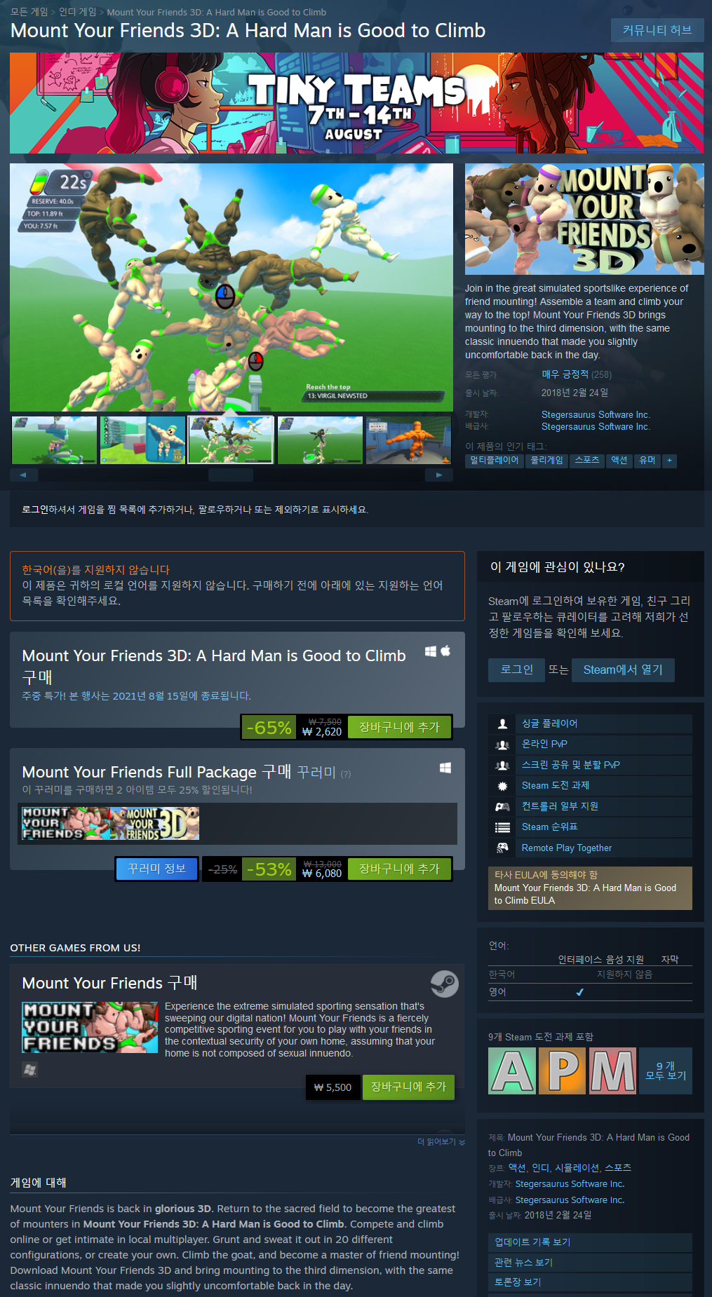 Mount Your Friends is back in glorious 3D. Return to the sacred field to become the greatest of mounters in Mount Your Friends 3D: A Hard Man is Good to Climb. Compete and climb online or get intimate in local multiplayer. Grunt and sweat it out in 20 different configurations, or create your own. Climb the goat, and become a master of friend mounting! Download Mount Your Friends 3D and bring mounting to the third dimension, with the same classic innuendo that made you slightly uncomfortable back in the day.