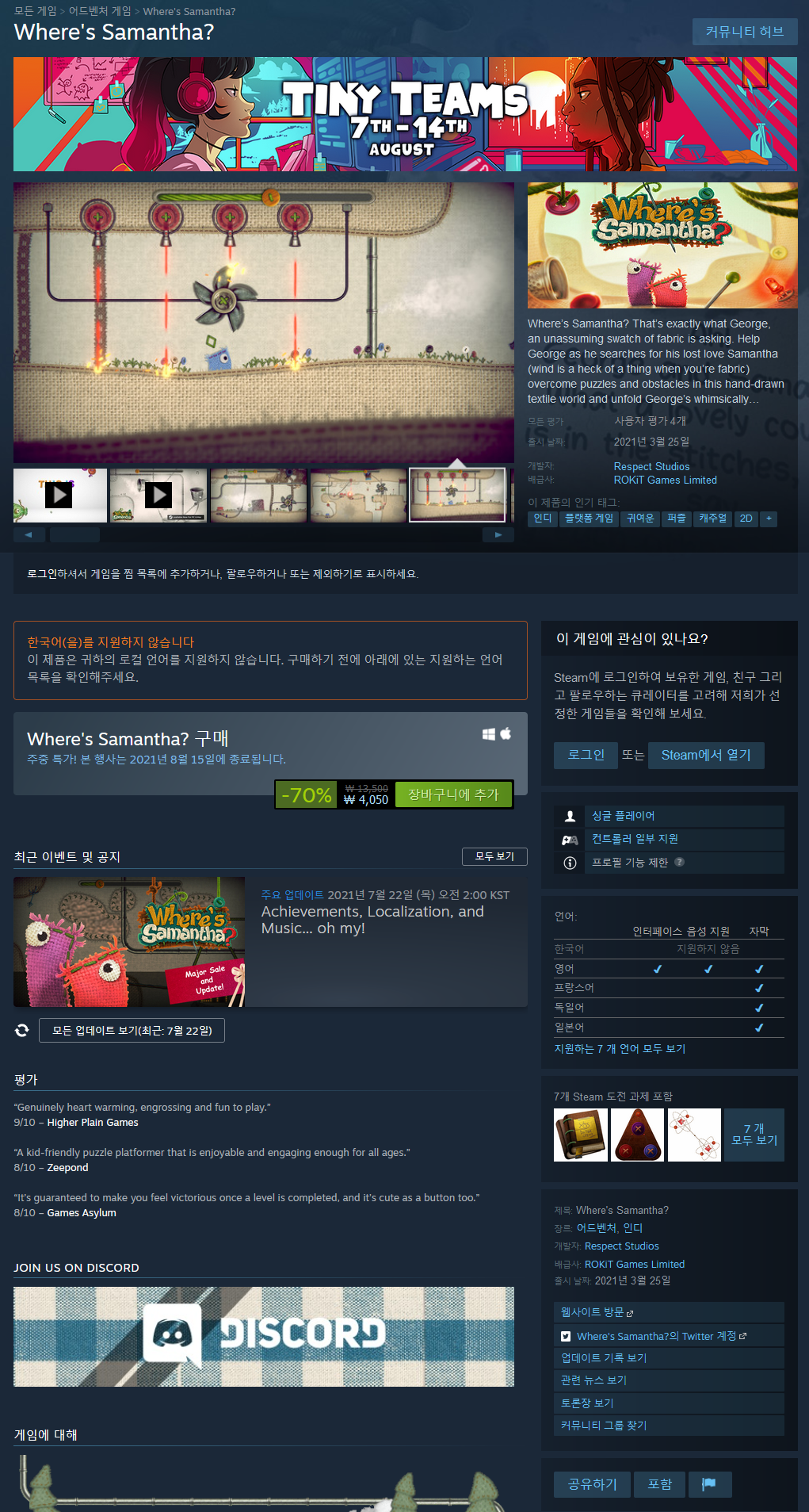 퍼즐 플랫포머를 좋아한다면 이음새 없이 잘 엮여 있는 Where's Samantha?의 패브릭 세계로 뛰어들어 재미있는 염색 방법이 포함된 퍼즐과 실을 결합하세요. 겨울왕국 2에서 올라프가 사만다를 찾는 모습을 떠올리게 했기 때문에 처음에 제목이 눈에 들어왔다고 고백합니다. 그런데 막상 게임을 들여다보니 뭔가 귀여운 컨셉 같다는 생각이 들어서 평소 즐겨하던 게임과는 다르지만 해보기로 했다.