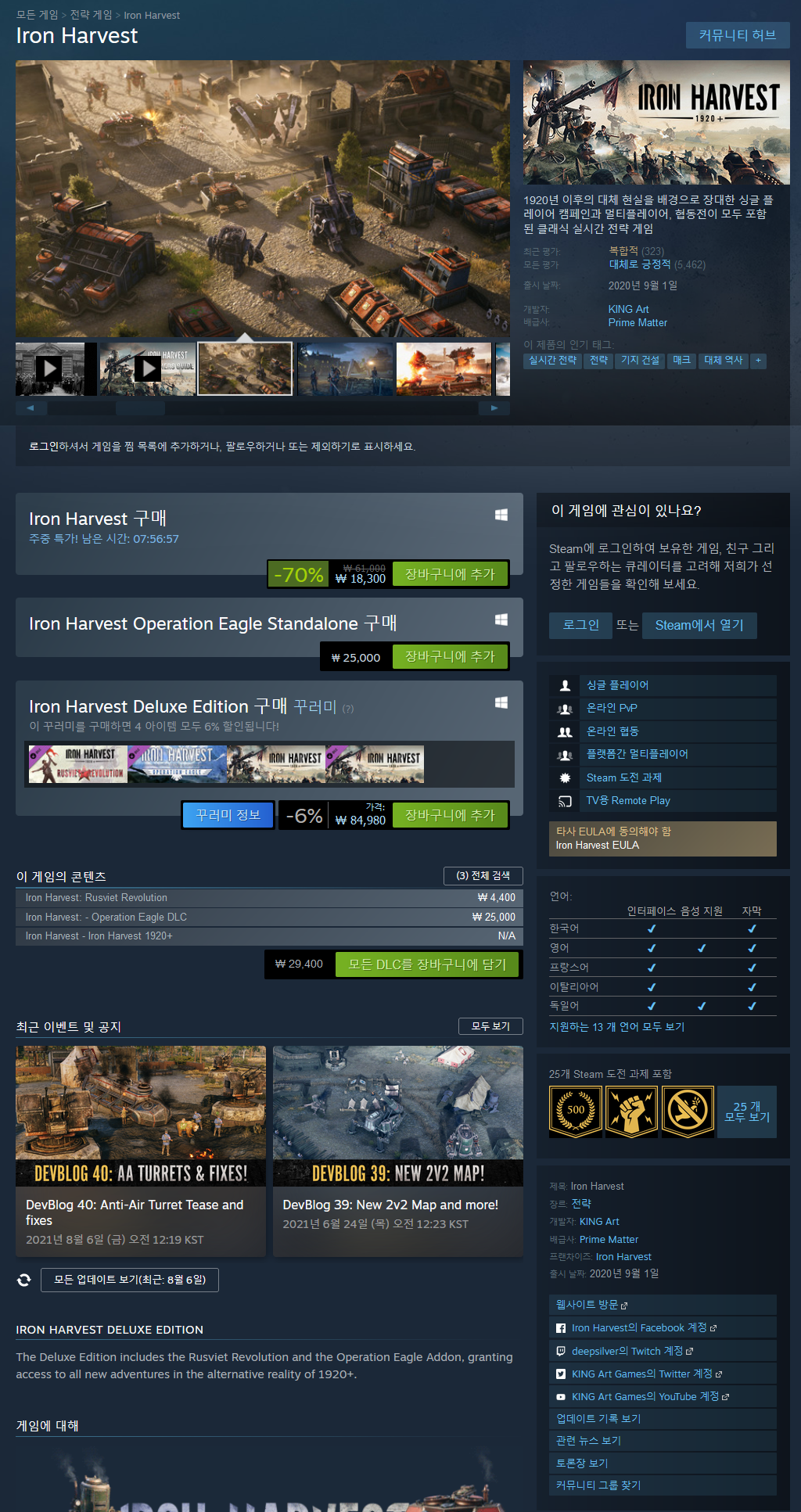 Iron Harvest는 제1차 세계대전 직후 1920년 이후의 대체 현실을 배경으로 하는 실시간 전략 게임(RTS)입니다. 거대한 디젤펑크 메카를 직접 조종하여 장대한 싱글플레이어 및 협동전 캠페인을 즐기고, 멀티플레이어 팬들을 위한 강렬한 전투가 펼쳐지는 대전에도 뛰어들 수 있죠. 클래식 실시간 전략 게임 팬들이 아주 오랫동안 기다려 온 게임인 Iron Harvest를 만나보세요.