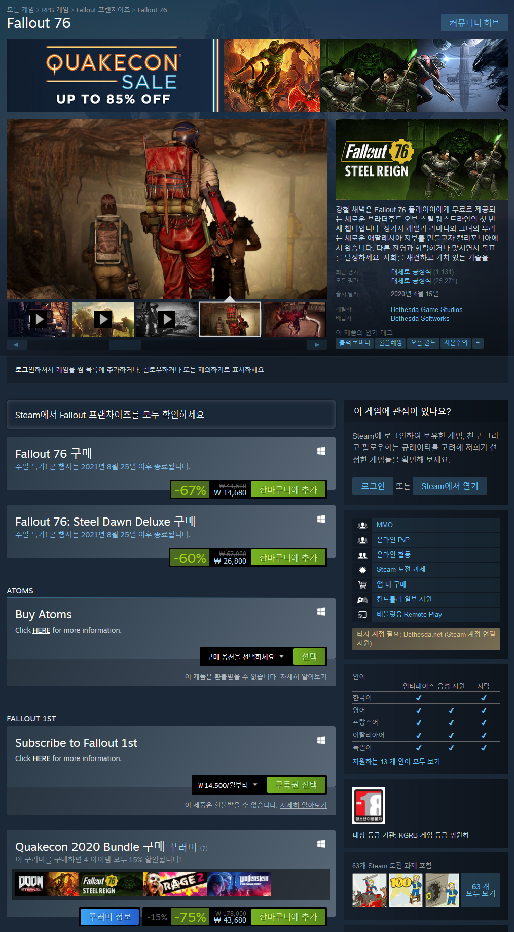 처음출시나 2년전이라면 모르겠지만 버그는 뭐 아직존재하고 서버 끊기고 그럼 그럼에도 나는 폴아웃팬이고 무료로 해보고 할인할때 14000원주고 샀는데 14000원 값어치는 하는듯하다 요즘에서는 그런수준까지 올라온듯하다 현시점에서 게임만 놓고 보면 즐길꺼리 많고 유저 꽤나있고 간지나는 파워아머도 있고 그래픽도 4보다 좋고 단 할인할때 사는것을 추천