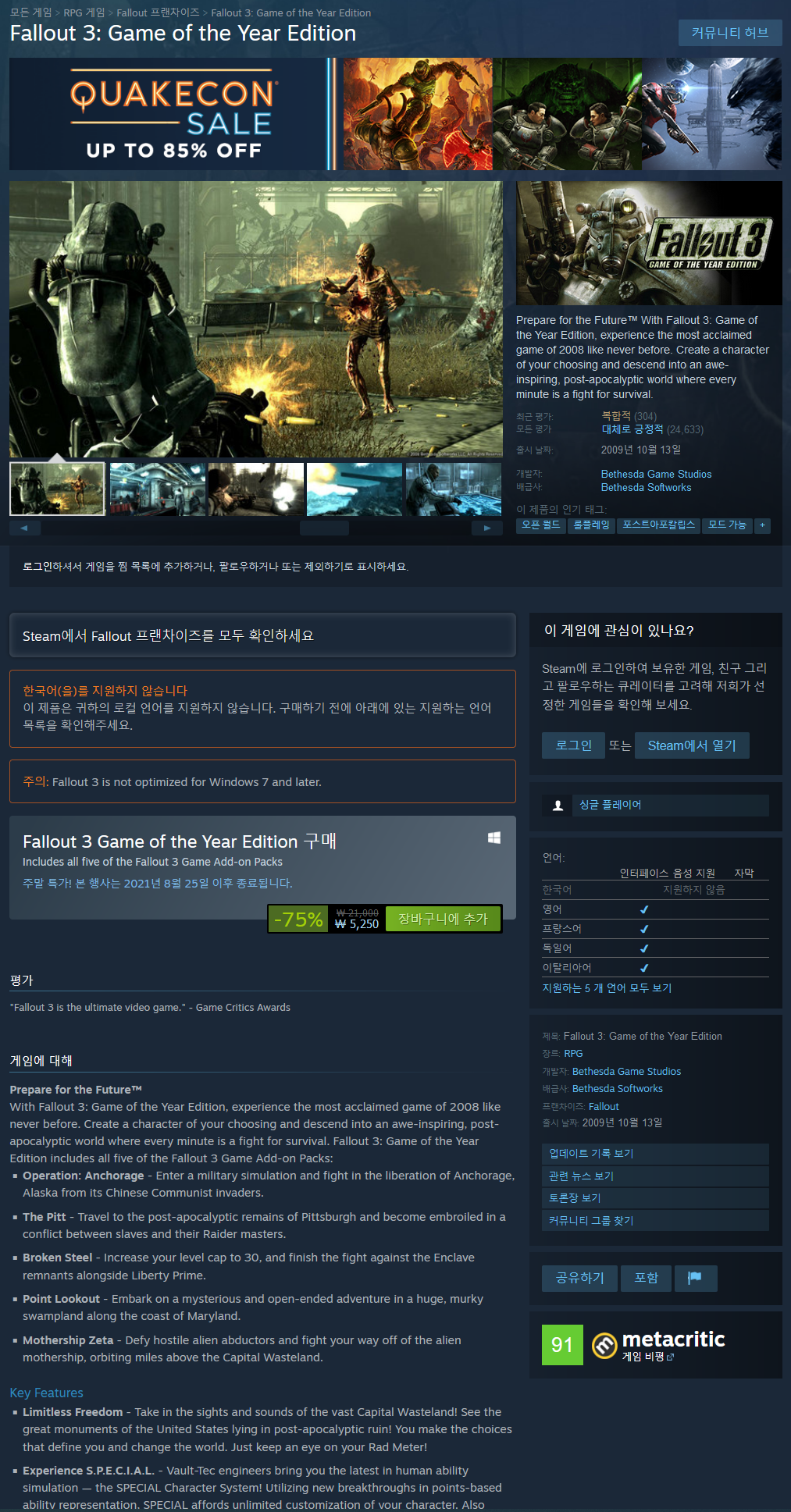 그러던 나는 장장 5년 동안이나 폴아웃3의 모든 퀘스트를 한번에 깨지 않고, 깔고 또 깔고, 깨고 또 깨고, 안 가고 피하고 하면서 여전히 많은 서브퀘스트를 즐기기 위해 남겨두었고, 장장 백수십만원을 들여 최근 장만한 데스크탑으로 풀옵션으로 드디어 이 게임을 돌리게 되었다.