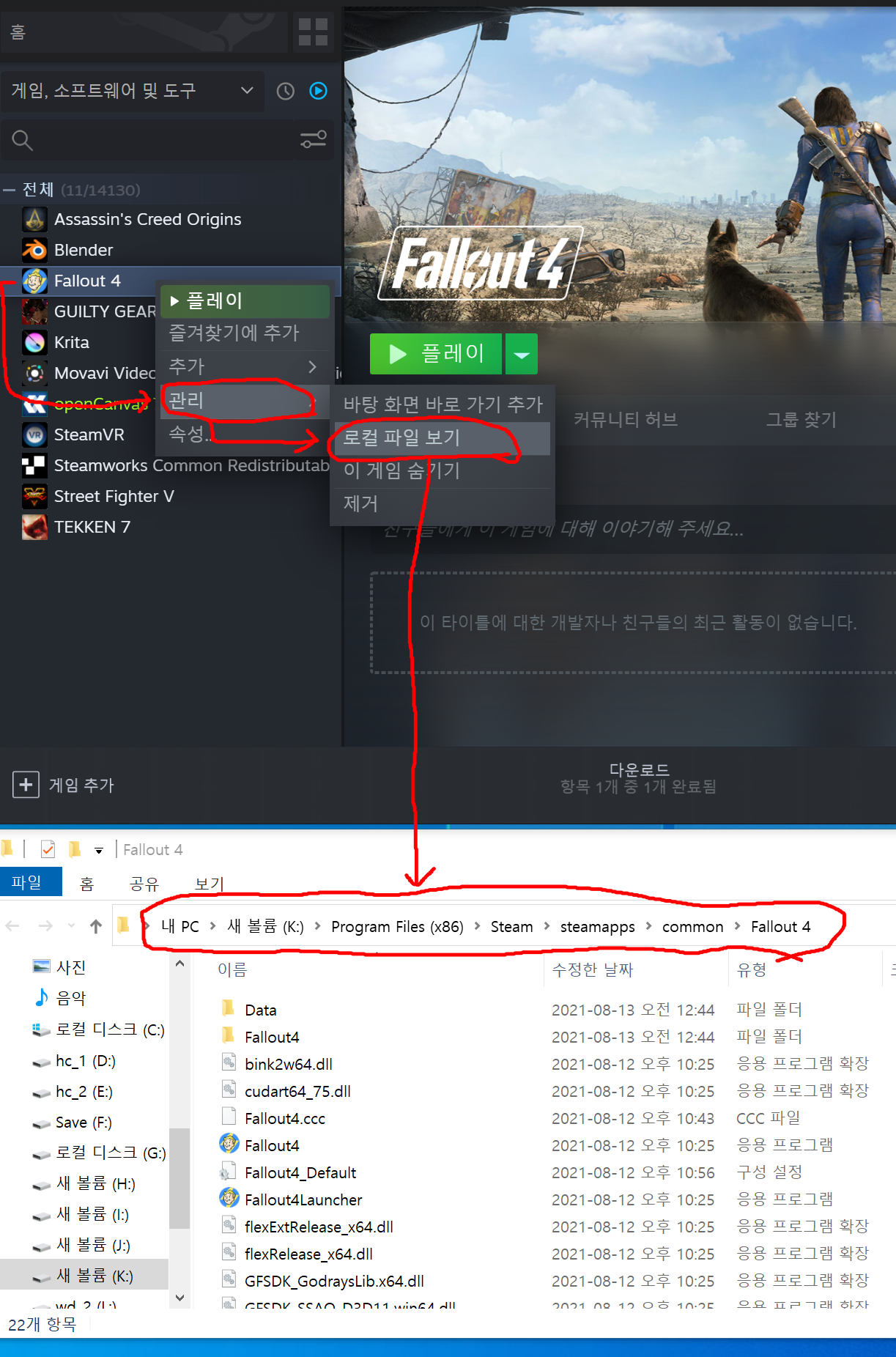오른쪽 클릭후 "관리->로컬 파일 보기" 를 눌러주면 해당 설치된 폴더가 나옵니다.
