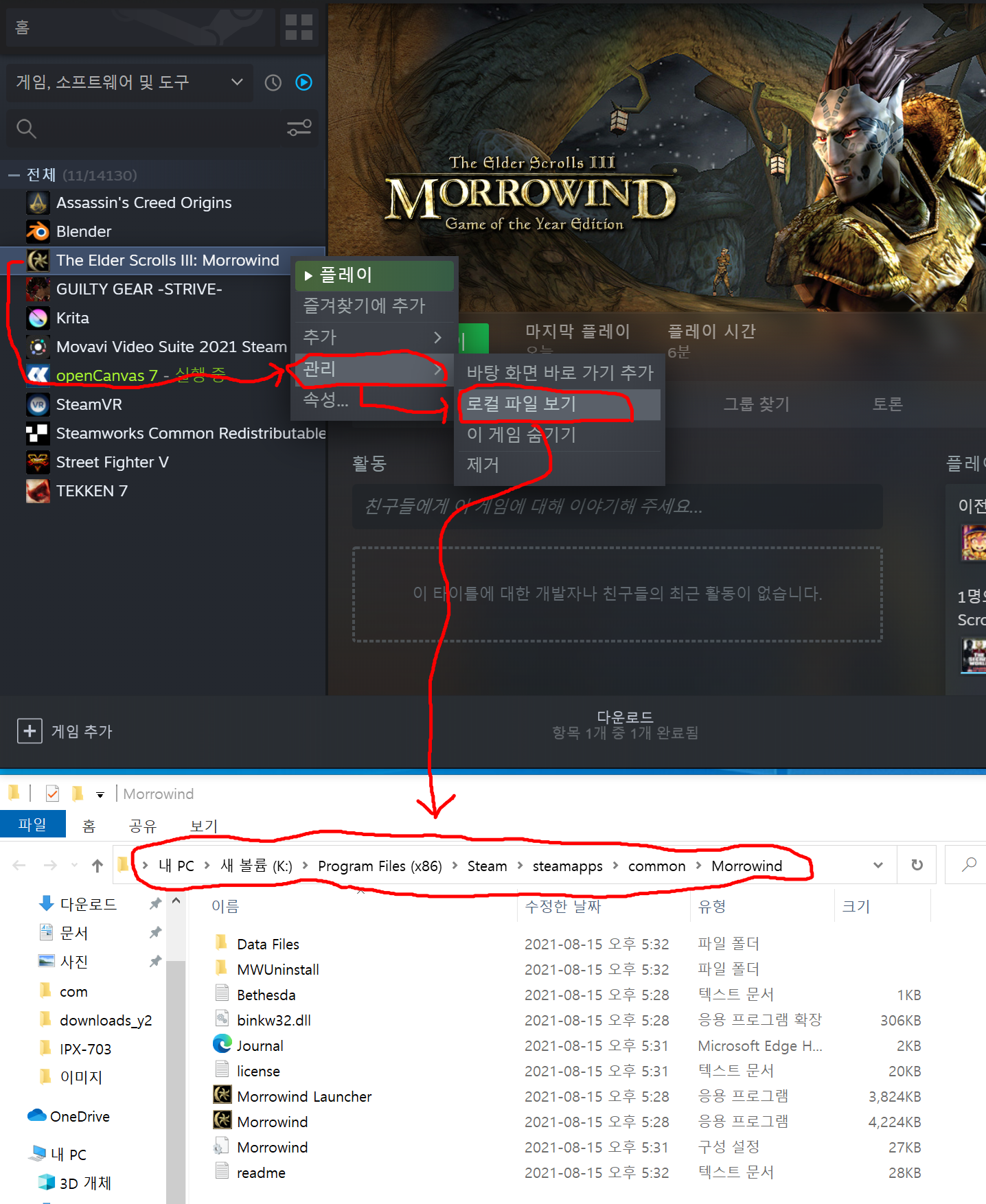 오른쪽 클릭후 "관리->로컬 파일 보기" 를 눌러주면 해당 설치된 폴더가 나옵니다.