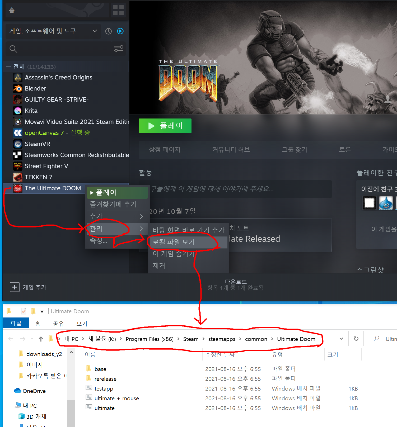 오른쪽 클릭후 "관리->로컬 파일 보기" 를 눌러주면 해당 설치된 폴더가 나옵니다.
