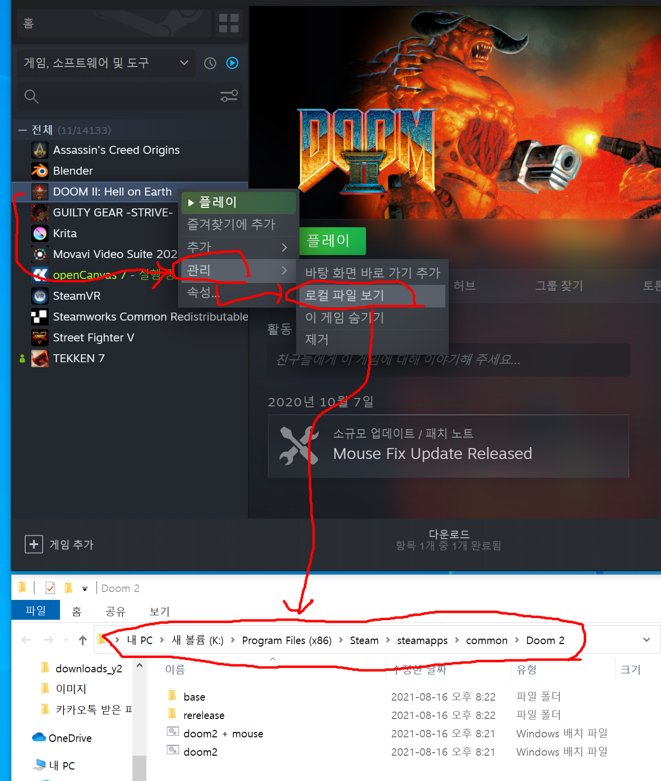 오른쪽 클릭후 "관리->로컬 파일 보기" 를 눌러주면 해당 설치된 폴더가 나옵니다.