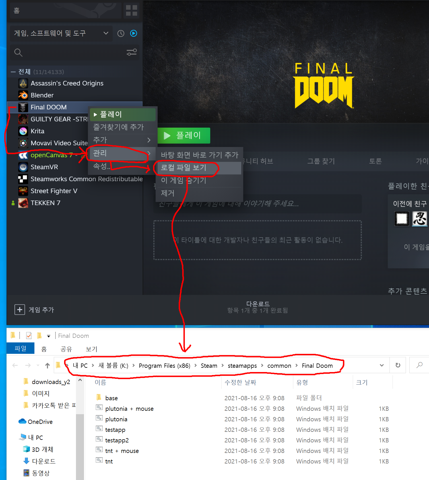 오른쪽 클릭후 "관리->로컬 파일 보기" 를 눌러주면 해당 설치된 폴더가 나옵니다.