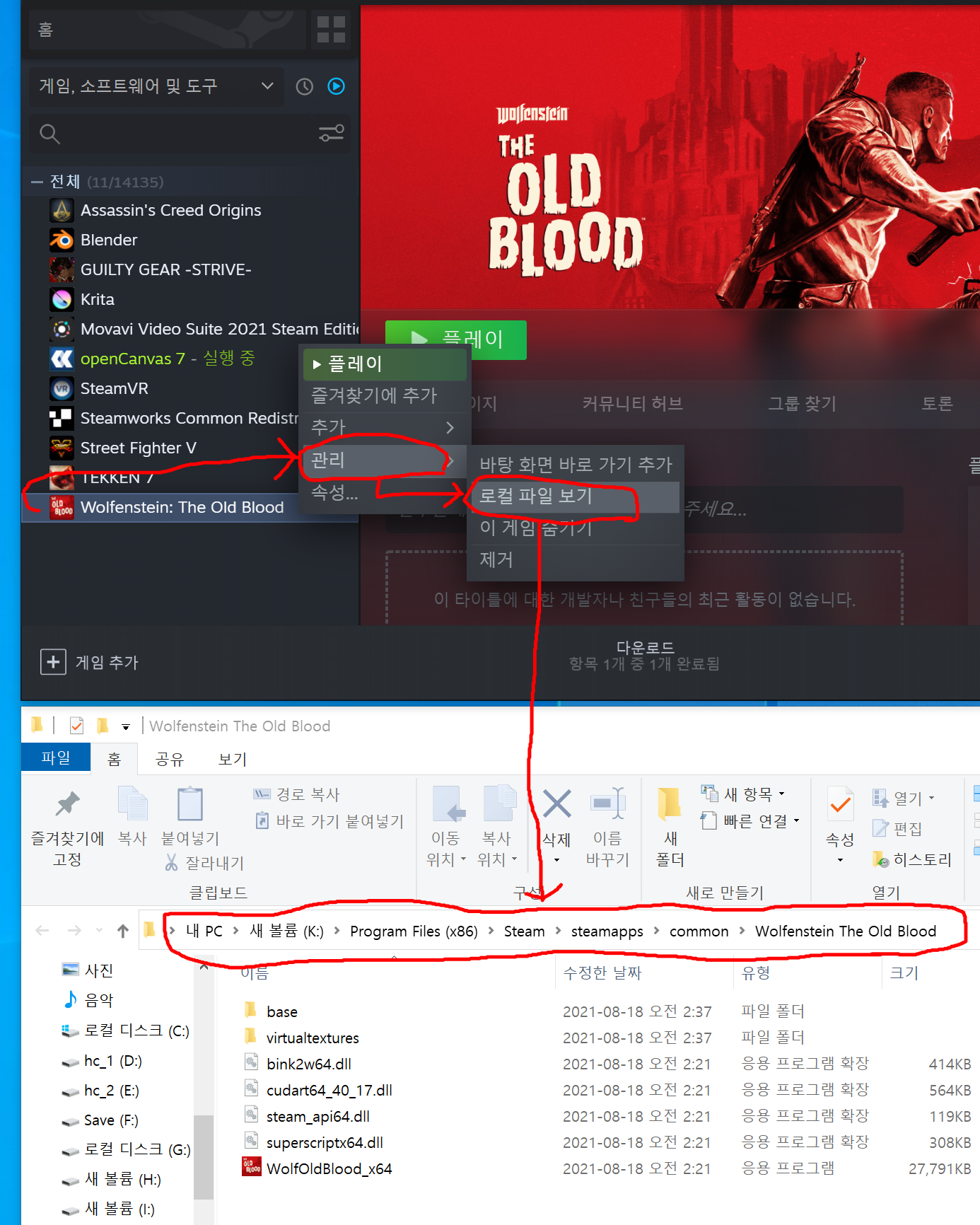 오른쪽 클릭후 "관리->로컬 파일 보기" 를 눌러주면 해당 설치된 폴더가 나옵니다.