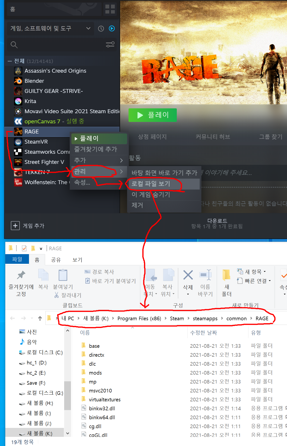 오른쪽 클릭후 "관리->로컬 파일 보기" 를 눌러주면 해당 설치된 폴더가 나옵니다.