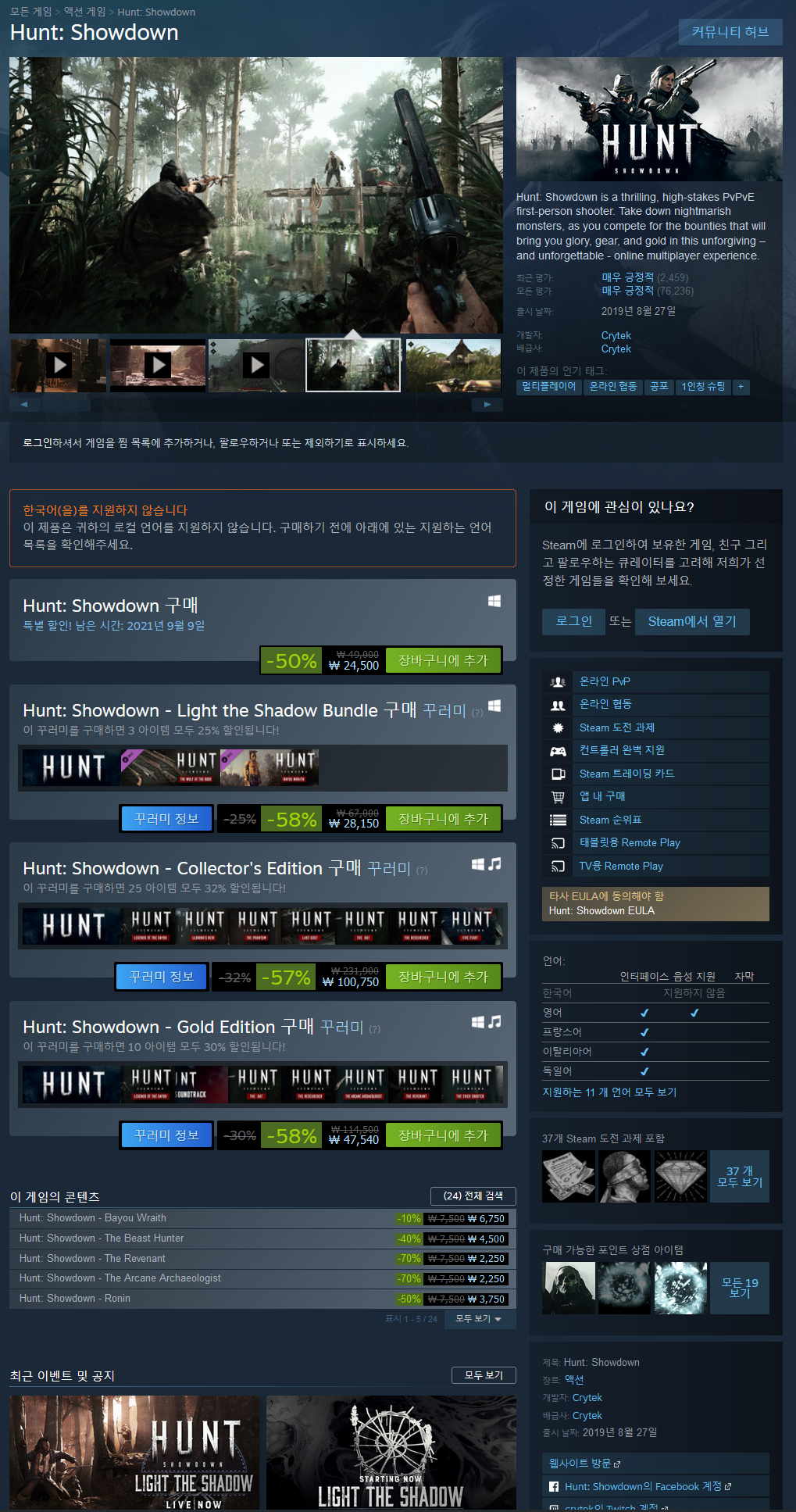1895년, 당신은 루이지애나 바이유에 만연한 야만적이고 악몽 같은 괴물을 제거하는 임무를 맡은 헌터입니다. 목표를 추적하고 같은 보상을 노리는 다른 헌터와 경쟁하는 데 도움이 되는 단서를 검색하면서 혼자 또는 2~3명으로 구성된 팀으로 플레이하십시오. 목표물을 죽이고 추방하고 현상금을 모은 다음 결전을 준비하십시오. 현상금이 손에 들어오면 지도의 다른 모든 사냥꾼이 당신의 상품을 노릴 것입니다. 잔인하고 시대에 영감을 받은 무기로 어둡고 무자비한 세계에서 싸우면서 자비를 베풀지 마십시오. 레벨을 올리고, 장비를 잠금 해제하고, 혈통을 위한 경험과 금을 모으십시오.