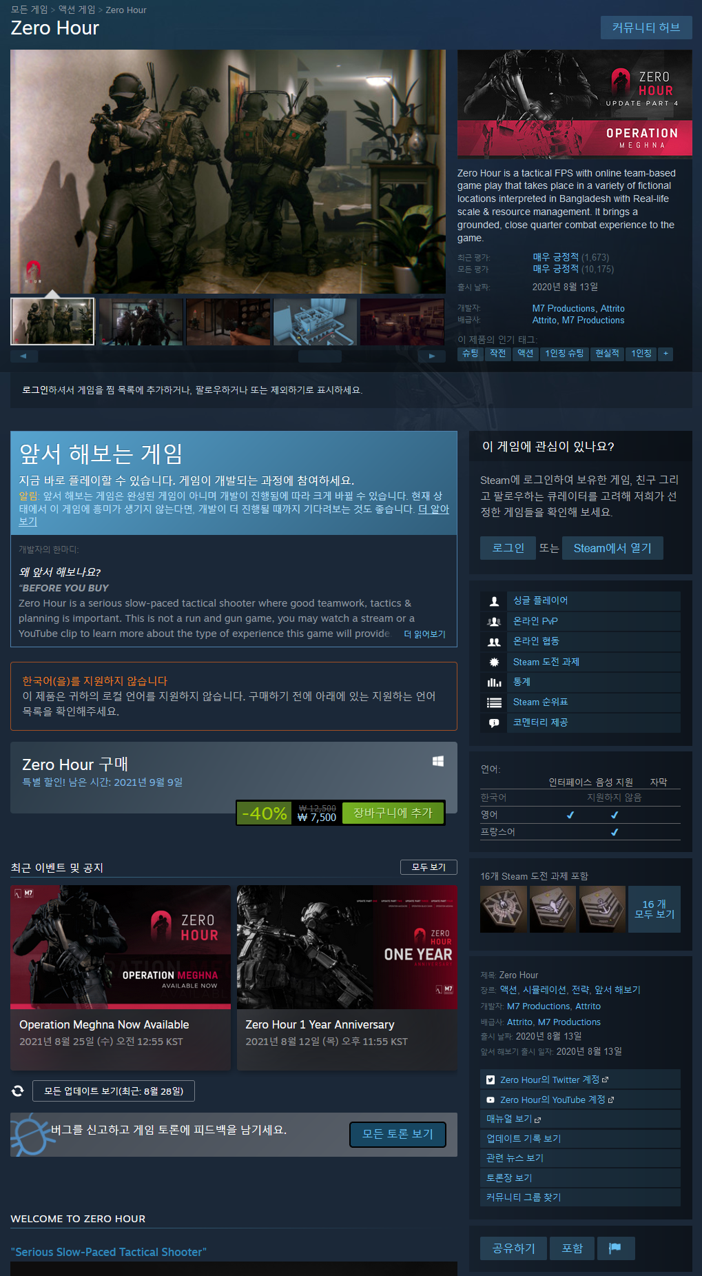 방글라데시의 다양한 위치에서 일어나는 온라인 팀 기반 액션 게임 플레이의 전술 FPS로 실제 규모 및 리소스 관리를 제공합니다. 다른 다양한 전술 슈팅 게임에서 영감을 받은 Zero Hour는 실제 규모(비디오 게임 규모 없음) 및 리소스 관리가 가능한 위치에서 매우 기초적인 CO-OP 및 팀 대 팀 경험을 제공하려고 합니다. 멀티플레이어에서 양측은 다른 팀을 전멸시키고 목표를 완료해야 합니다. 방어자들은 폭탄이 해체되지 않도록 보호하고 인질이 구출되어 달아나는 것을 막아야 합니다. 반대로 공격자들은 폭탄을 해체하거나 인질을 구출해야 합니다. 협동 모드에서는 플레이하기로 결정한 지도에 따라 탈출을 요청하기 위해 완료해야 하는 몇 가지 목표가 있습니다.